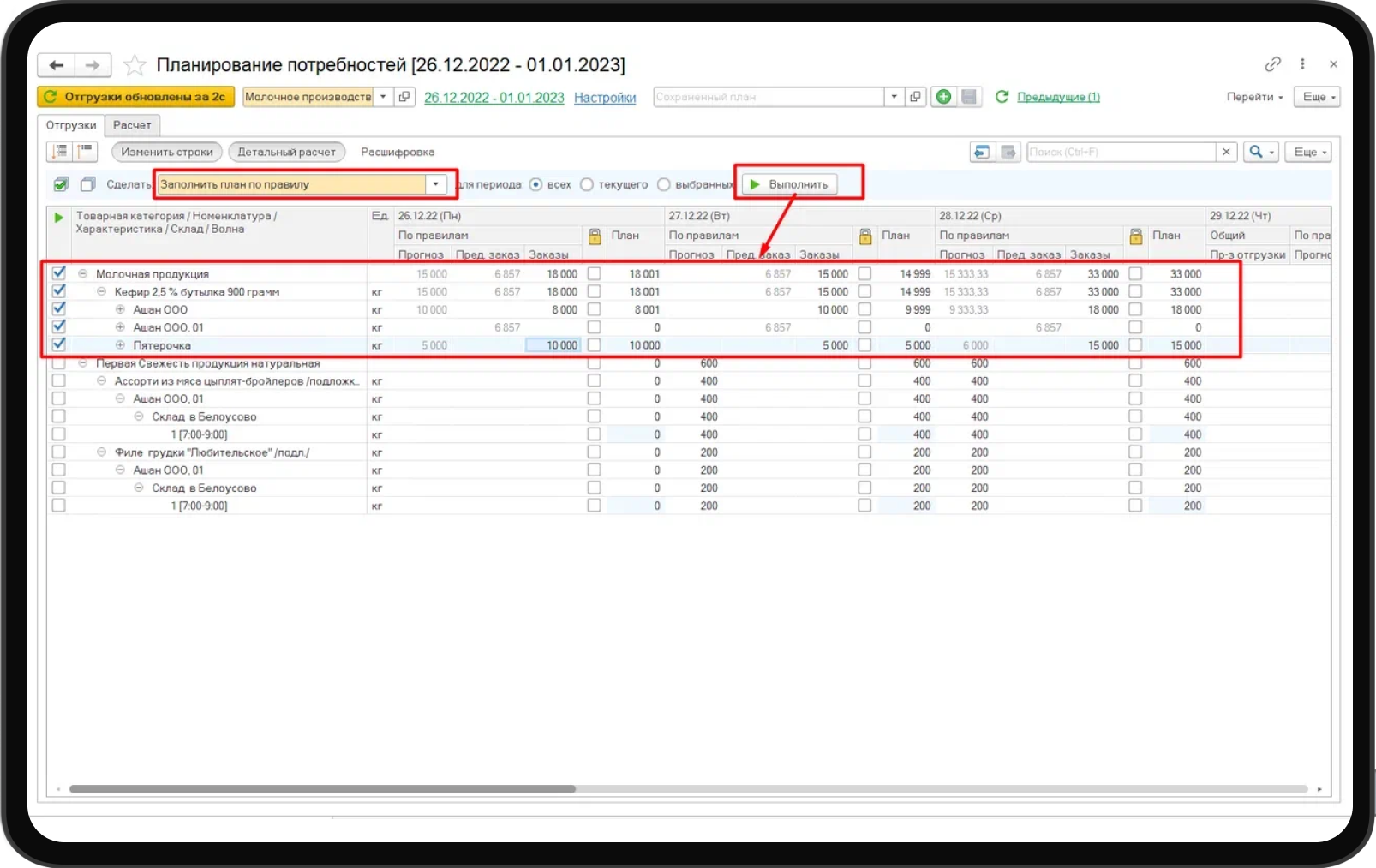 При помощи встроенного рабочего места автоматически рассчитывается потребность в сырье,упаковке и загрузка оборудования. Это позволяет проанализировать исполнимость задания на производство и скорректировать его при необходимости.