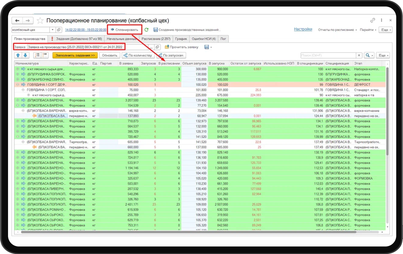 Необходимые параметры по производству продукта (длительность цикла, минимальный замес, нормативный запас) заполняются автоматически. На основании этих данных система рассчитывает объемы запуска + определяется дата выпуска базового продукта.